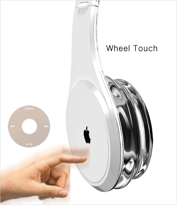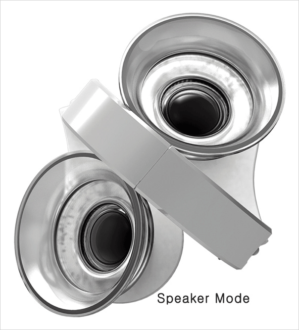 헤드폰 양쪽의 투명한 이어패드를 빼서 반대로 끼우면 이어패드는 확성기 역할로 스피퍼가 되는 간단한 방식으로 한쪽 헤드폰 측면에는 아이팟과 같이 플레이어를 조작할 수 있는 휠터치 기능을 갖춘 컨셉트 디자인입니다.