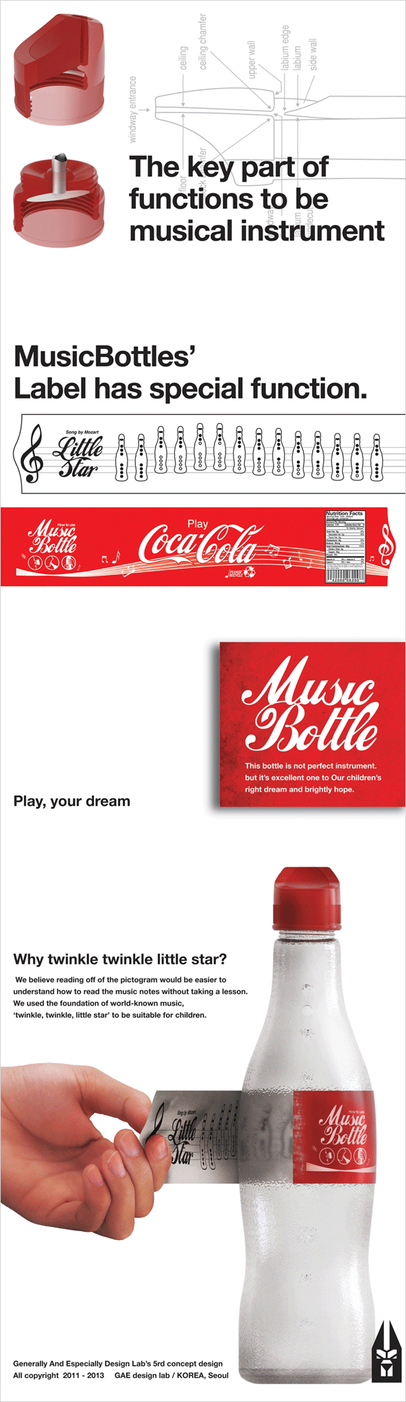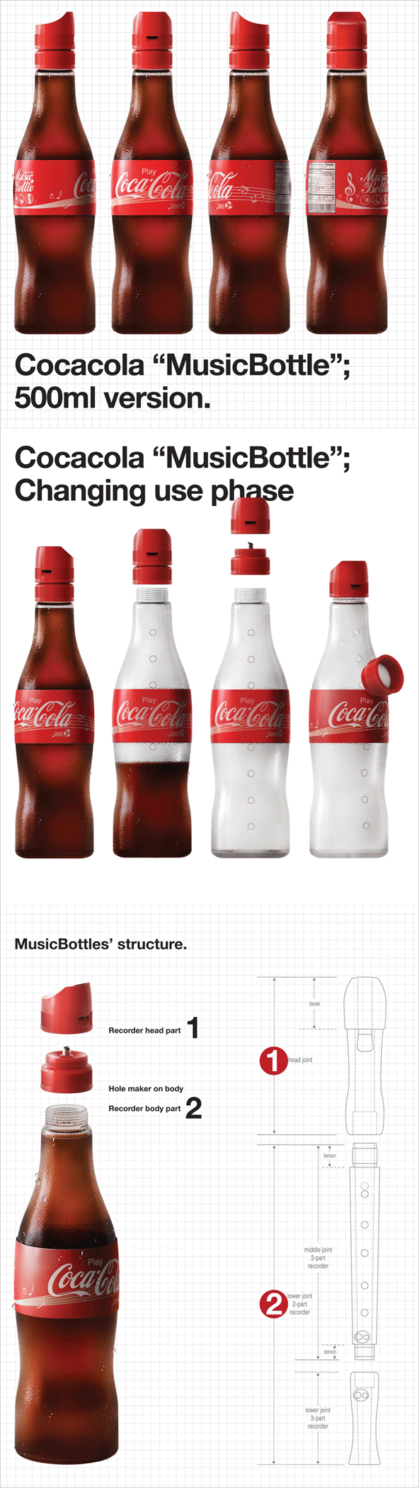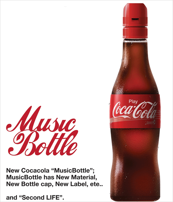 | 코카콜라는 오래전부터 'Enjoy Coco-Cola'란 슬로건을 사용하고 있지만 디자이너는 이 디자인을 통해 새로운 슬로건을 제시하기도 합니다. 'Play Coca-Cola' 코카콜라를 즐기면서 가지고 놀 수 있게 버려지는 콜라병을 다시 리코더로 활용할 수 있도록 하였습니다. |