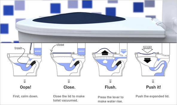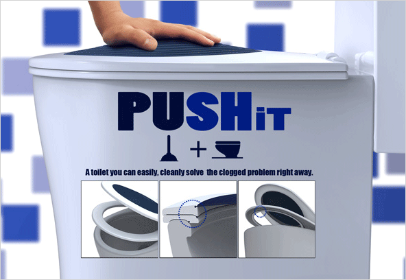 디자이너 정허영 씨가 디자인한 컨셉트 변기 커버 '푸쉿'입니다. 푸쉿은 변기 시트 덮게에 압축식 고무 장치(플런저)를 장착하여 변기가 막혔을 경우 뚫어줄 수 있는 변기 시트입니다. 변기 시트와 뚜러뻥의 일체형 디자인입니다.