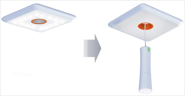 지진이나 화재로 인해 진동이나 큰 소음을 감지하여 조명등은 아래쪽으로 내려오게 되고
