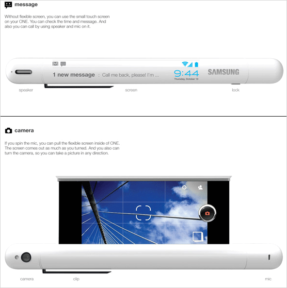 원은 하나의 펜 모양으로 디자인된 휴대폰으로 6인치 크기의 플렉시블 디스플레이와 클라우드 컴퓨팅 환경을 채택하였으며, 일반적인 휴대폰과 같이 펜에는 카메라,마이크,마이크로 USB포트,장금버튼이 내장되어 있으며,