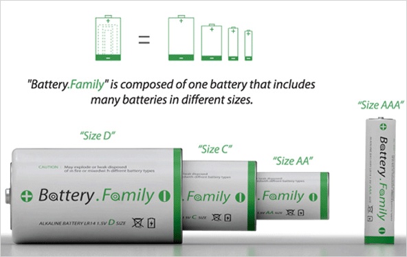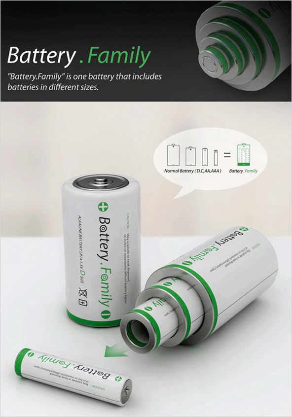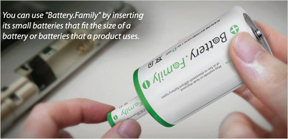 | 건전지 '배터리.패밀리'입니다. 배터리 패밀리는 이름대로 식구의 개념으로 시중에 유통되고 있는 건전지 사이즈 D,C,AA,AAA형을 하나의 건전지로 모았습니다. |