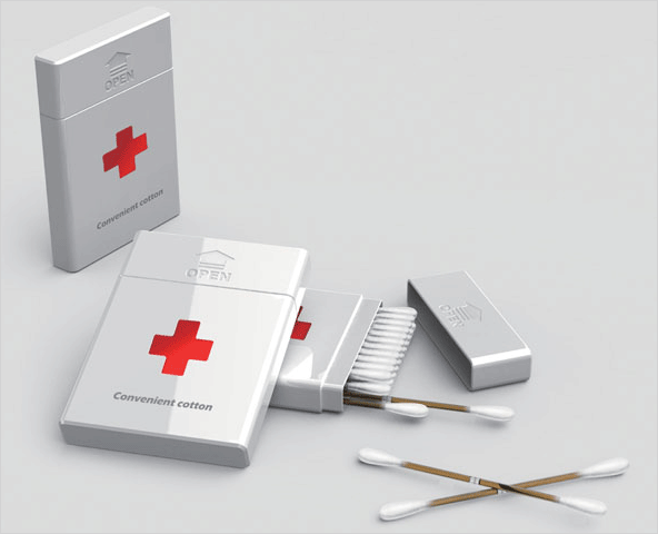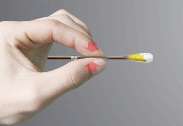 이런 문제에 대한 솔루션을 제공한 이 면봉은 나무재질의 막대 대신에 투명한 튜브를 사용하고, 투명한 튜브 막대 안의 액체 살균제를 포함하고 있습니다. 상처가 났을때 간단하게 튜브를 살짝 눌러주면 솜에 살균제가 흡수되어 바로 상처 주위를 소독할 수 있게 하였습니다.