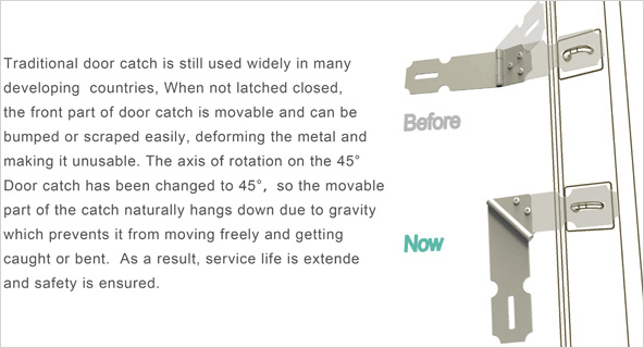 그러나 이 45˚ 도어 캐치는 래치를 수평에서 수직 방향으로 전환하기 위해 래치의 경첩 부분을 90˚ 에서 45˚ 의 각도로 바꾸어 래치가 수직 방향으로 향하도록 하였습니다. 이로써 안전하고 오래 사용할 수 있도록 발상의 전환으로 새롭게 디자인된 래치입니다.
