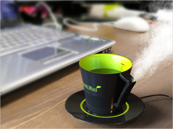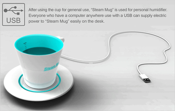 USB로 연결해 열을 발생시켜주는 컵 받침과 가습 기능을 추가한 컵으로 구성