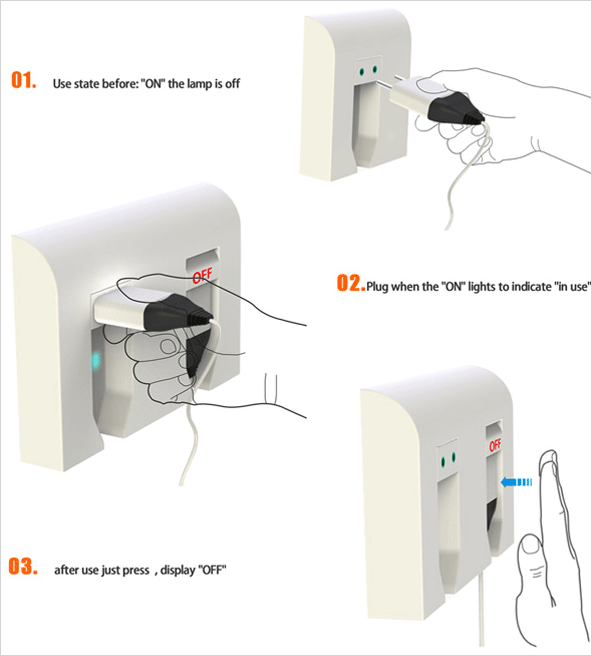 | 통상의 소켓보다 조금 두꺼운 모습이며, 콘센트를 가리면 ON이 점등되고, 전류가 흐르고 있는 것을 확인할 수 있습니다. 사용후에는, 콘센트를 아래에 내리기만 하면 전원이 차단되어 OFF 상태가 표시되므로, 전기의 이용의 유무를 한눈에 확인하는 것이 가능합니다. |
