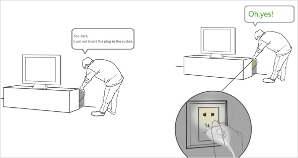 | 플러그에 LED와 함께 충전식 베터리가 내장되어 있어 플러그의 버튼만 눌러주면 어두운 야간이나 가구 뒤의 콘센트에도 플러그의 LED 조명으로 보다 쉽게 꽂을 수 있도록한 플러그 디자인입니다. 콘센트에 꽂혀있는 동안 자동적으로 충전도 되어지는 창의적인 아이디어입니다. |