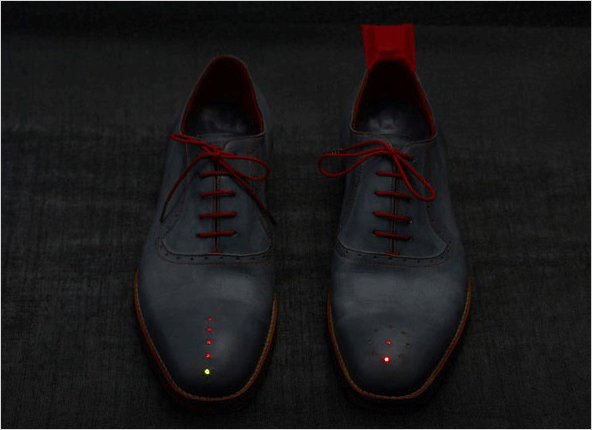 오른쪽 신발 일자형 LED는 목적지와의 거리를 표시해 목적지에 도착했을시 녹색 불빛으로 표시하는 재미있고, 기발한 발상의 컨셉트입니다.