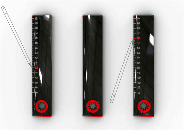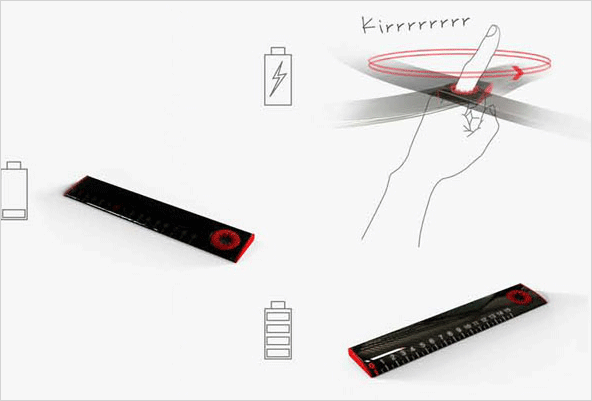 또한 자 전체에는 터치 스크린으로 단위를 표시하고, 이에 사용되는 전력은 자의 끝부분 구멍에 연필 또는 손가락을 끼워 빙빙 돌려주면 발생되는 운동에너지를 전환할 수 있는 발전기를 내장 필요한 전력을 생성합니다.