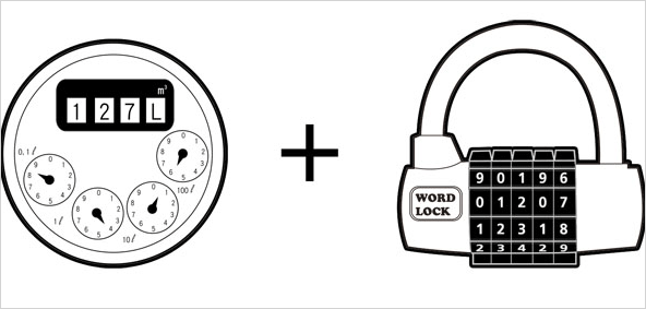 금속 재질의 십자(+) 모양으로 기계식 계기판과 잠금장치인 다이얼로 형성되어 있는 워터 락은