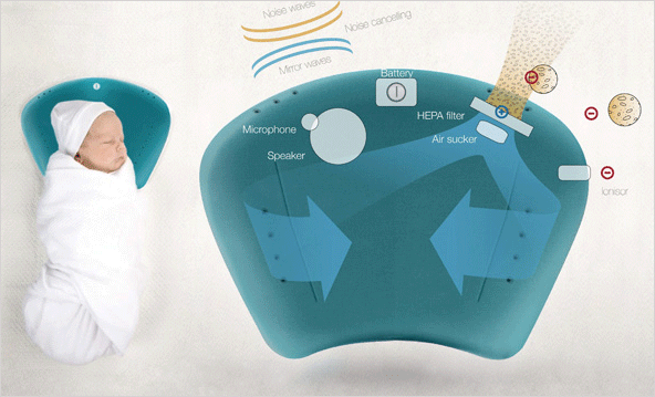 코쿤은 아기의 안전한 숙면 자세를 유지하며 주변의 소음을 차단하고 신선한 공기를 제공해주는 최첨단 베개입니다. 만성 소음을 제거해주는 장치와 공기 중의 미립자를 여과하는 헤파 공기 정화 시스템,