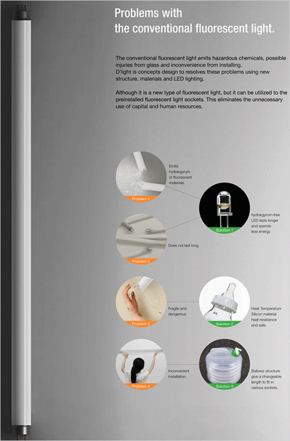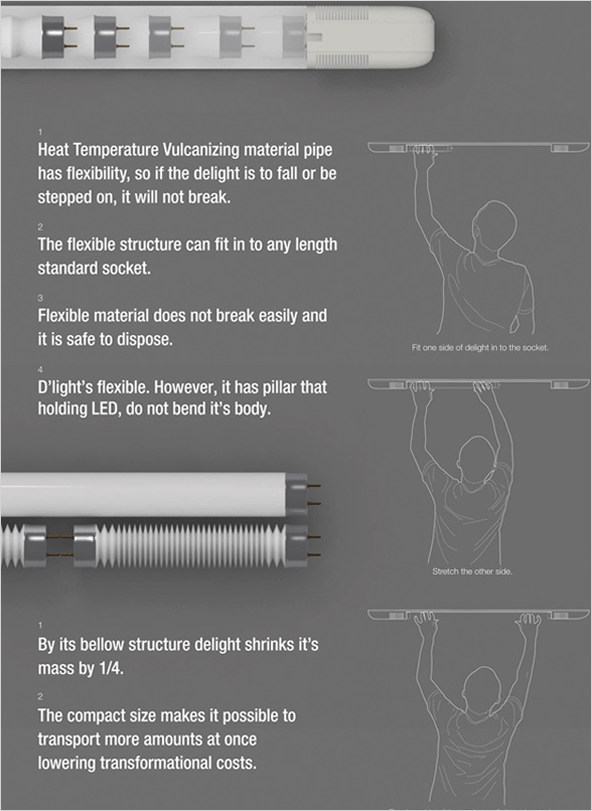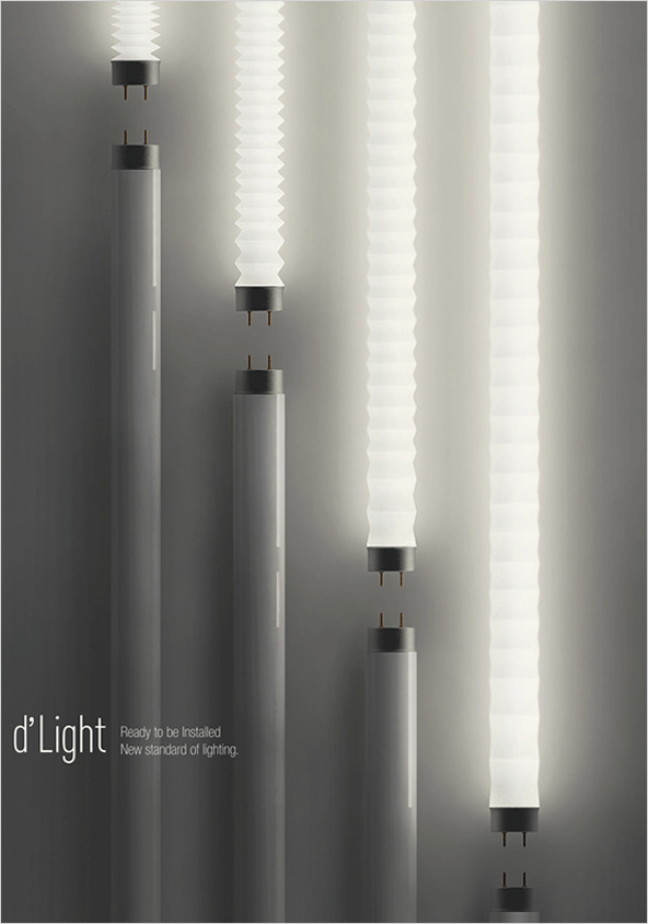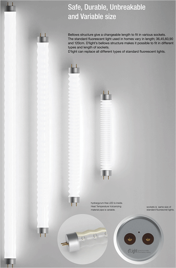 크기가 다른 점등관(형광등 소켓)에도 이 디 라이트 하나만으로 안전하게 장착할 수 있는 신개념 LED 형광등 디자인입니다.
