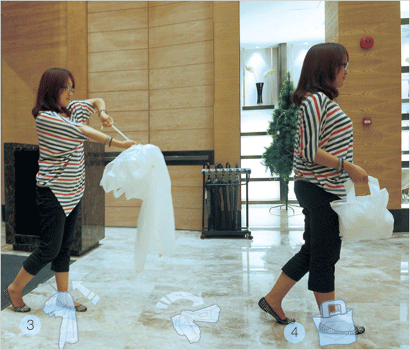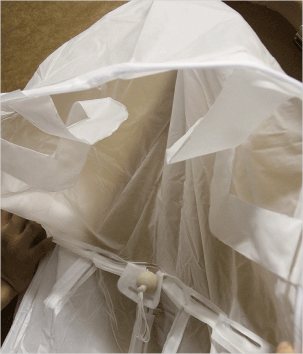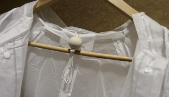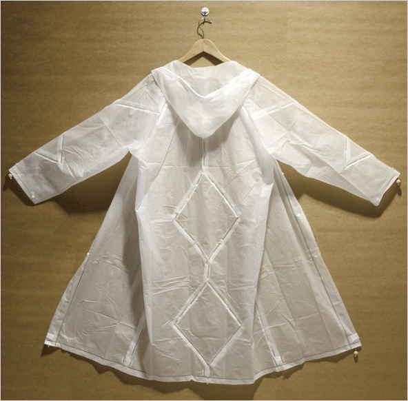 그러나 오늘 소개할 작품은 우비 내부의 양쪽 팔과 등쪽 부분에 하나의 긴 끈이 연결되어 있어 목 부분의 돌출된 끈을 죽 당기면 긴 우비는 작은 가방 모양으로 바뀌게 되어 간단하게 들고 다닐 수 있습니다.