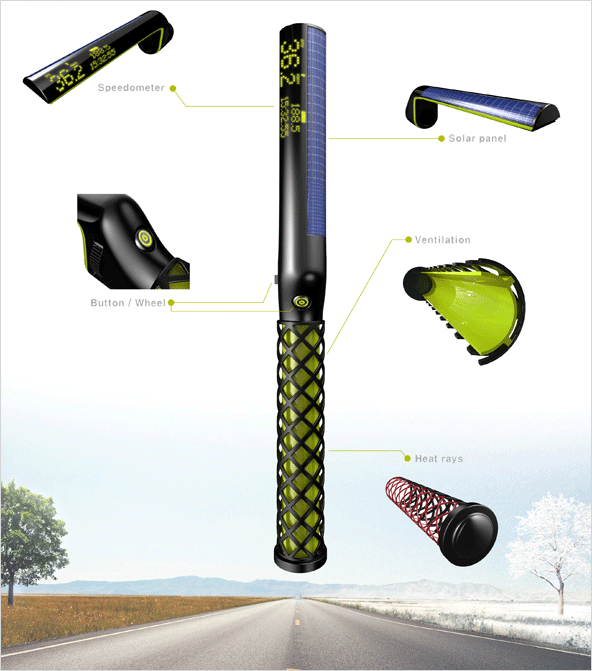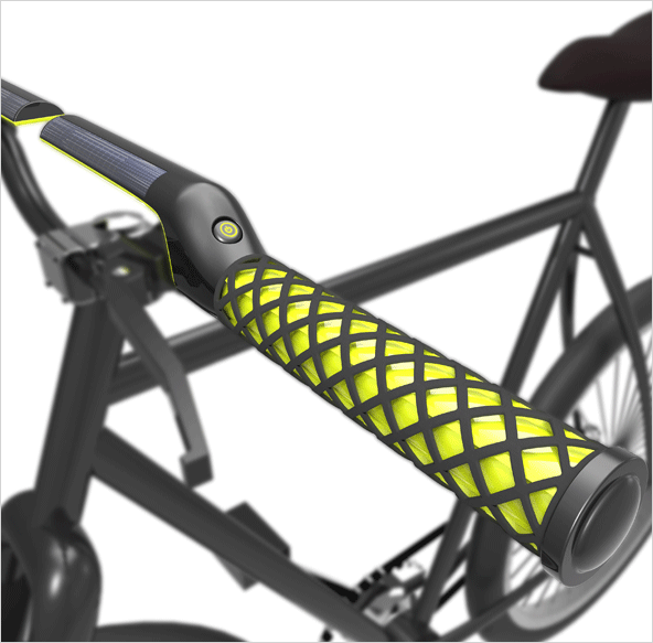 | 핸들 그립에서 확장된 부분에는 태양열 집열판이 내장되어있고, 속도계가 장착되어 디스플레이를 통해 속도를 확인할 수 있는 자전거 핸들 그립입니다. |