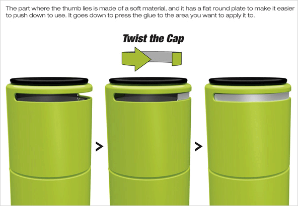 그리고 넓은 부분을 풀칠할때는 기존의 딱풀처럼 캡을 열고 풀칠할 수도 있게 2가지 타입으로 디자인된 아이디어 제품입니다.