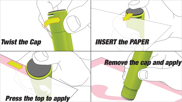 캡을 돌려 '一(일)'자형 홈을 오픈한 상태에서 그 홈 사이에 풀칠할 종이를 끼워 살며시 잡아 당기면