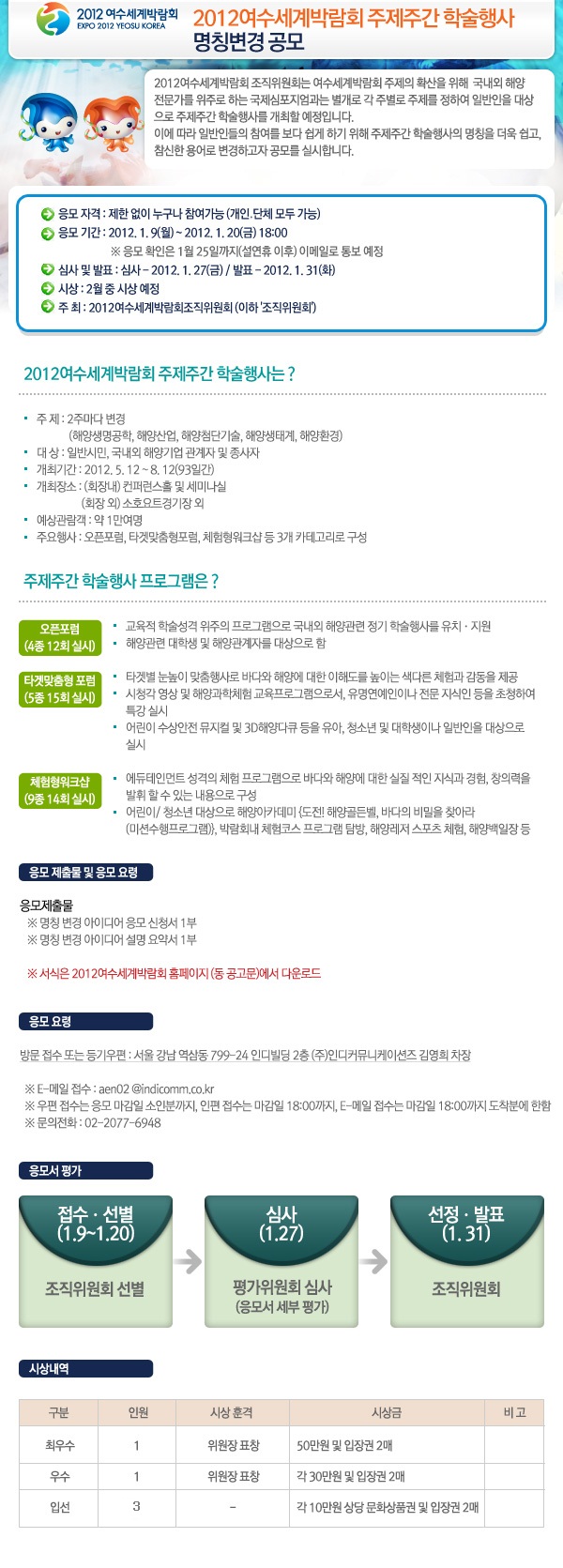 박람회 기간 중 주별로 해양관련 주제를 선정하여 해양인식의 저변확대를 위해 소수 전문가만을 위한 학술행사를 탈피, 주로 일반인을 대상으로교육적 학술회의 및 바다와 해양에 대한 이해도를 높이는 타겟별 맞춤형식의 다양한 체험행사로 즐겁고 재미있는 공유와 참여의 장을 구성하는 "주제주간 학술행사"의 기존 네이밍을 더욱 쉽고, 참신한 용어로 변경하고자 공모를 실시합니다.